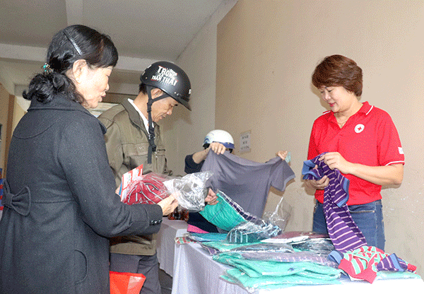 Người dân đang chọn cho mình chiếc áo phù hợp tại phiên Chợ