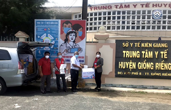 Tặng quà tới các y, bác sĩ tại Trung tâm Y tế huyện Giồng Riềng.