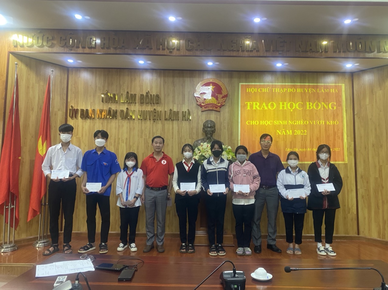 Chiều cùng ngày Hội Chữ thập đỏ tỉnh phối hợp với nhà tài trợ là Công ty TNHH MTV Xổ số kiến thiết tỉnh Lâm Đồng đã trao 20 suất học bổng cho các em học sinh nghèo hiếu học của huyện Lâm Hà, mỗi suất trị giá 500.000 đồng.