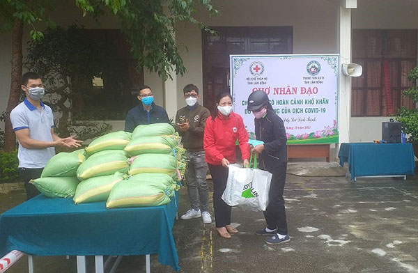 Bà Nguyễn Thị Hà (áo đỏ) – Phó chủ tịch Hội Chữ thập đỏ tỉnh Lâm Đồng trao lương thực, thực phẩm