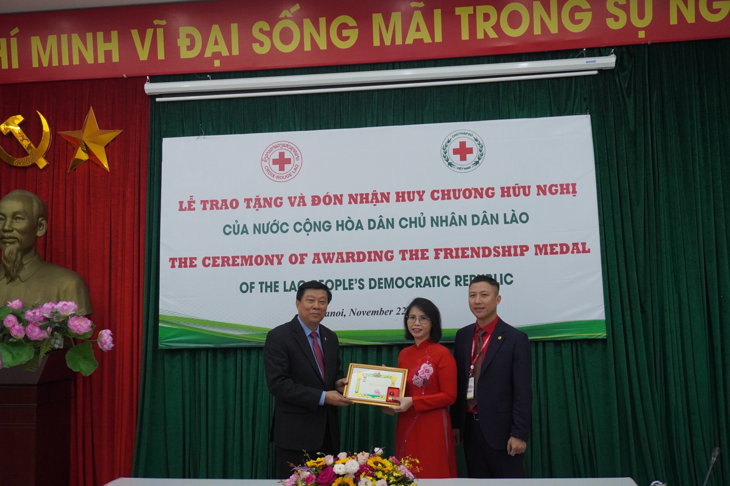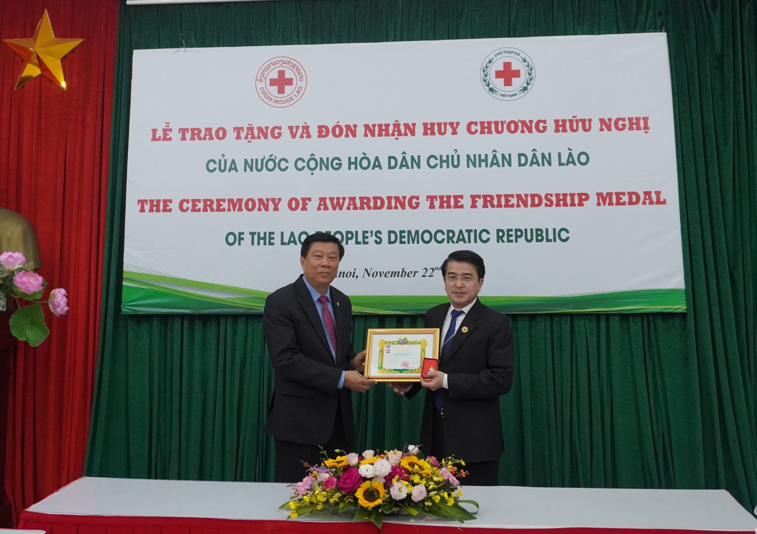 Ngày 22/11, tại Hà Nội, Trung ương Hội Chữ thập đỏ Việt Nam đã tổ chức Lễ đón nhận Huy chương Hữu nghị của Chính phủ nước CHDCND Lào. Tham dự buổi Lễ có bà Bùi Thị Hoà, Chủ tịch Hội Chữ thập đỏ Việt Nam; Ông Phouthone MuongPak, Chủ tịch Hội Chữ thập đỏ Lào.