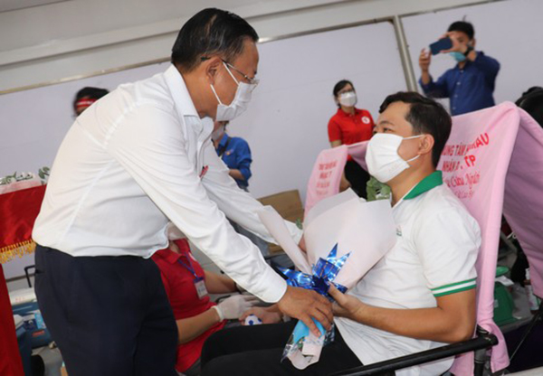 Ông Nguyễn Hữu Hiệp – Ủy viên Ban Thường vụ, Trưởng Ban Dân vận Thành ủy Thành phố Hồ Chí Minh thăm hỏi, động viên và tặng hoa đến người tham gia hiến máu tình nguyện.