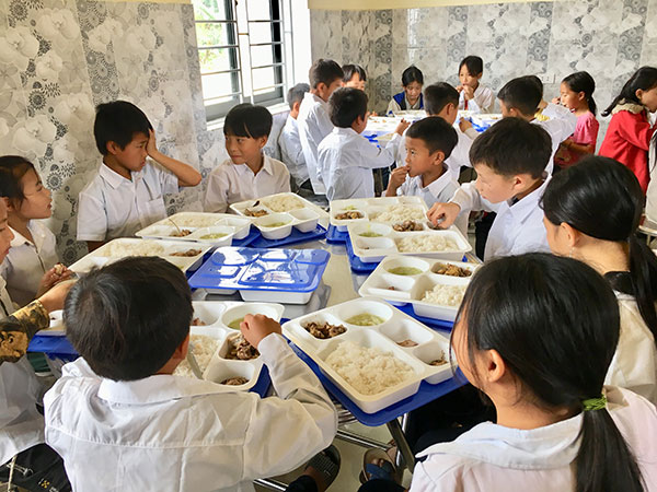 Các em học sinh trong niềm vui được ăn những bữa cơm có thịt.