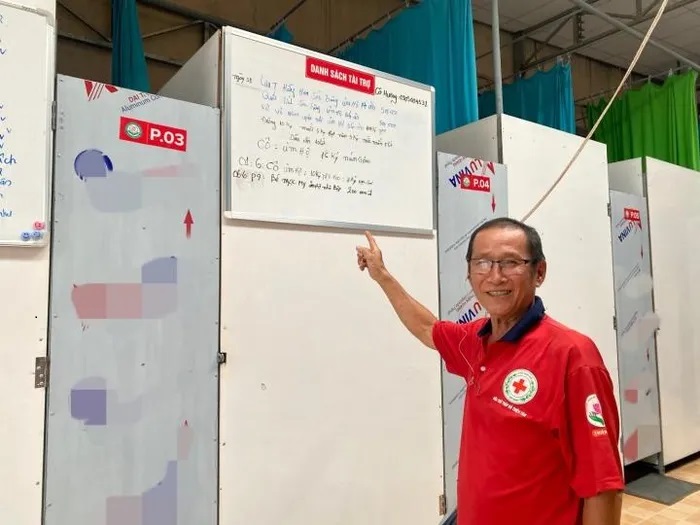 Ông Nguyễn Đăng Hoàng, Chủ tịch Hội Chữ thập đỏ Thiện Tâm tận dụng chiếc bảng trắng ghi lại danh sách các nhà hảo tâm đến nhà trọ 0 đồng quyên góp.
