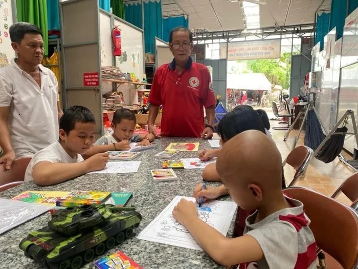 Mỗi tuần, ông Hoàng dành ra 2 ngày để dạy chữ, dạy vẽ cho các bé. Tiếp đến, ông lại dành tiếp 2 ngày cho việc vui chơi, ca hát. Giáo viên đứng lớp, trực tiếp chơi cùng các bé chính là phụ huynh đưa con đi trị bệnh. Dù mệt mỏi, thậm chí có chút lo lắng nhưng khi trở thành giáo viên cho con mình và những bệnh nhi khác, các ông bố, bà mẹ vẫn thay phiên nhau dạy chữ.