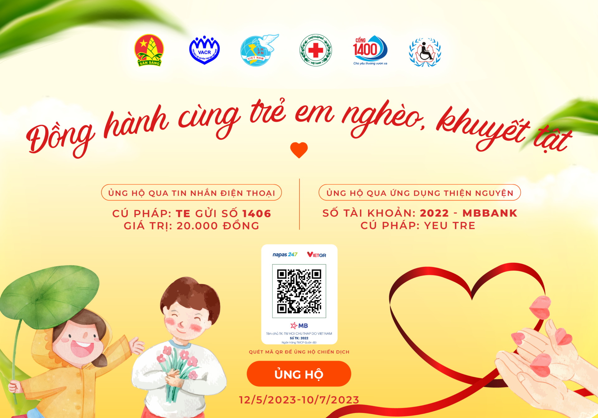 Cũng tại Hội thảo, các đại biểu đã cùng nhắn tin ủng hộ chương trình “Đồng hành cùng trẻ em nghèo, khuyết tật” trẻ do Trung ương Hội Chữ thập đỏ Việt Nam phối hợp với Cổng thông tin điện tử nhân đạo quốc gia 1400, Trung ương Hội Liên hiệp phụ nữ Việt Nam, Hội Đồng đội Trung ương, Hội Cứu trợ trẻ em tàn tật Việt Nam, Hội Bảo vệ Quyền trẻ em Việt Nam phát động. Chiến dịch nhằm vận động nhân dân cả nước chung tay ủng hộ nguồn lực để hỗ trợ lương thực, thực phẩm, phương tiện đi lại, bếp ăn, công trình vệ sinh nước sạch cho trẻ em nghèo, khuyết tật, mồ côi, bị ảnh hưởng bởi dịch COVID-19, trẻ em vùng đặc biệt khó khăn, góp phần cải thiện dinh dưỡng, điều kiện sống cho các em, đồng thời thông qua chương trình nâng cao nhận thức, sự quan tâm, chia sẻ của toàn xã hội đối với việc chăm sóc, bảo vệ trẻ em – những mầm non tương lai của đất nước. Chương trình được thực hiện từ ngày 12/5 đến 10/7/2023, soạn tin nhắn TE gửi 1406, mỗi tin nhắn trị giá 20.000 đồng hoặc chuyển khoản ủng hộ qua tài khoản số 2022, Ngân hàng TMCP Quân đội (MBBank), tên tài khoản: Trung ương Hội Chữ thập đỏ Việt Namm; nội dung chuyển khoản YEU TRE.