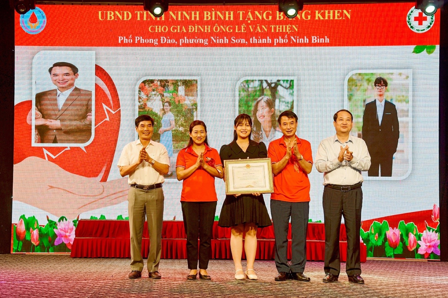Các đồng chí Lãnh đạo tỉnh Ninh Bình trao tặng Bằng khen của UBND tỉnh cho gia đình anh Lê Văn Thiện, nhân dịp kỷ niệm ngày Quốc tế người hiến máu 14/6/2023.