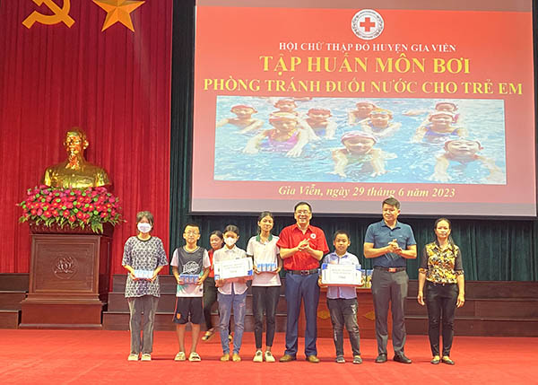Lãnh đạo Hội Chữ thập đỏ tỉnh trao tặng quà cho các em học sinh trên địa bàn huyện Gia Viễn tham gia lớp tập huấn phòng tránh đuối nước dịp nghỉ hè.