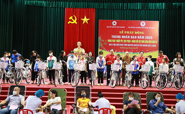 Hội Chữ thập đỏ tỉnh Ninh Bình và các nhà hảo tâm trao tặng xe đạp cho các em học sinh nghèo vượt khó học giỏi tại Lễ phát động Tháng nhân đạo năm 2023.
