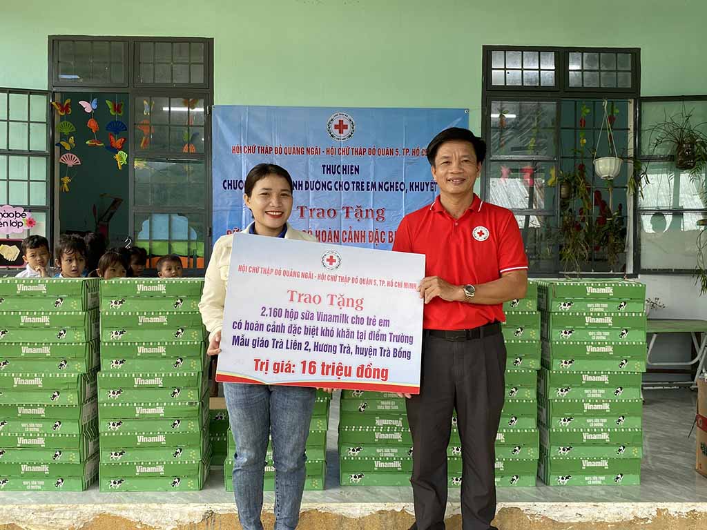 Nhân ngày Quốc tế Tình nguyện viên 05/12, Hội Chữ thập đỏ tỉnh Quảng Ngãi, Đội tình nguyện viên Chữ thập đỏ tỉnh, Hội Chữ thập đỏ huyện Trà Bồng tổ chức Chương trình trao tặng sữa cho các cháu Mẫu giáo tại điểm Trường Trà Liên 2, xã Hương Trà và điểm Trường Thôn Quế, xã Trà Bùi, huyện Trà Bồng.