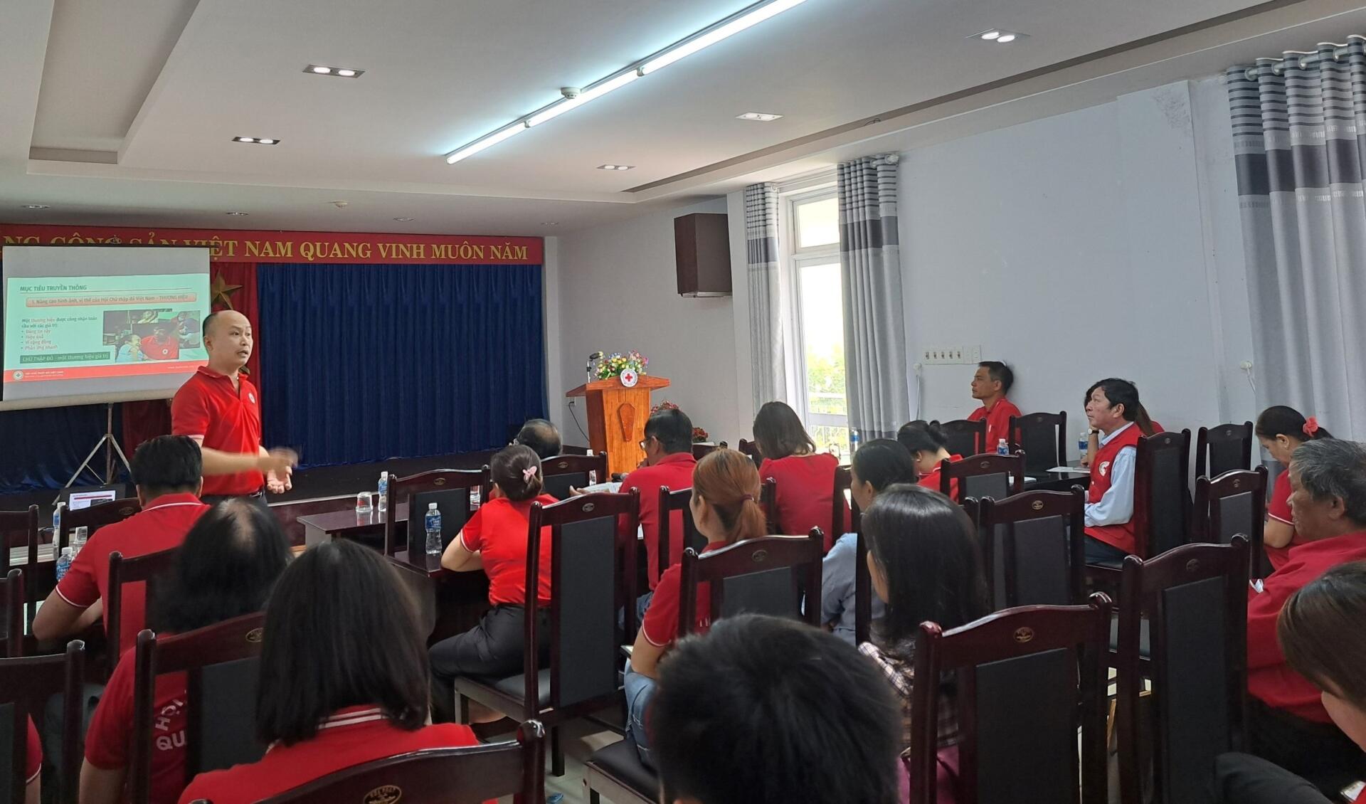 Quang cảnh lớp tập huấn truyền thông cho cán bộ Hội Chữ thập đỏ các cấp. Tại lớp tập huấn, báo cáo viên đã chia sẻ kiến thức kỹ năng viết tin bài cho các hoạt động của Hội Chữ thập đỏ như: bộ nhận diện thương hiệu Hội Chữ thập đỏ Việt Nam; mục tiêu,…