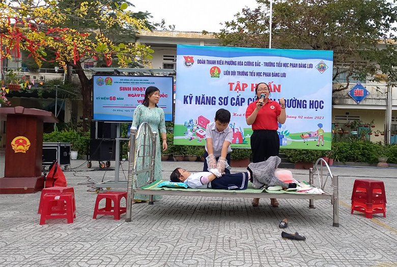Cán bộ Chữ thập đỏ đã hướng dẫn học sinh các kỹ năng sơ cứu chảy máu Trong buổi tập huấn, cán bộ Chữ thập đỏ đã hướng dẫn cho hơn 1.400 em học sinh tiểu học các kỹ năng như: Sơ cứu chảy máu, sơ cứu dị vật tắc đường thở, sơ cứu…