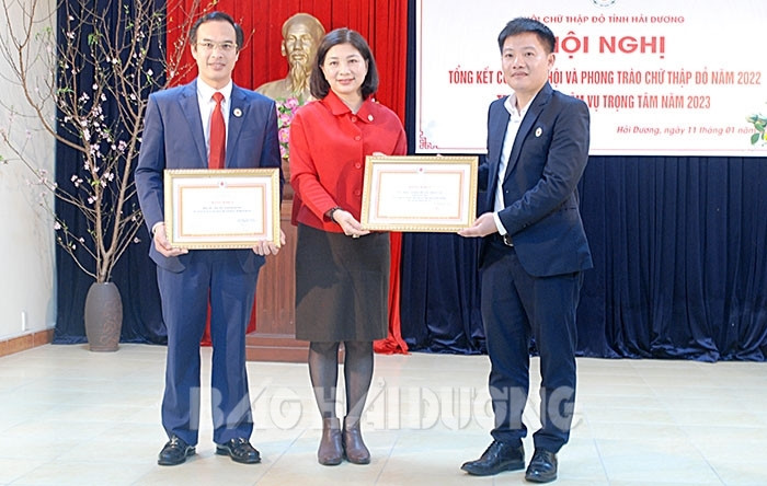 Trưởng Ban Truyền thông Trung ương Hội Chữ thập đỏ Việt Nam Trần Thu Hằng trao Bằng khen của Trung ương Hội cho Hội Chữ thập đỏ tỉnh Hải Dương Năm 2023, các cấp Hội Chữ thập đỏ tỉnh tiếp tục chú trọng phát triển cơ sở hội ở các cơ quan, doanh nghiệp, lực…