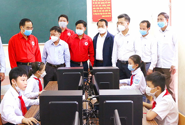 Ban tổ chức tham quan phòng học học máy tính mới được viết chịu Ảnh: Khắc Sáng Đến dự chương trình, có ông Bùi Văn Huấn – Chủ tịch Hội Chữ thập đỏ tỉnh Phú Thọ, ông Nguyễn Chí Thắng – Phó Bí thư Thường trực Huyện ủy Tam Nông, các đồng chí đại…