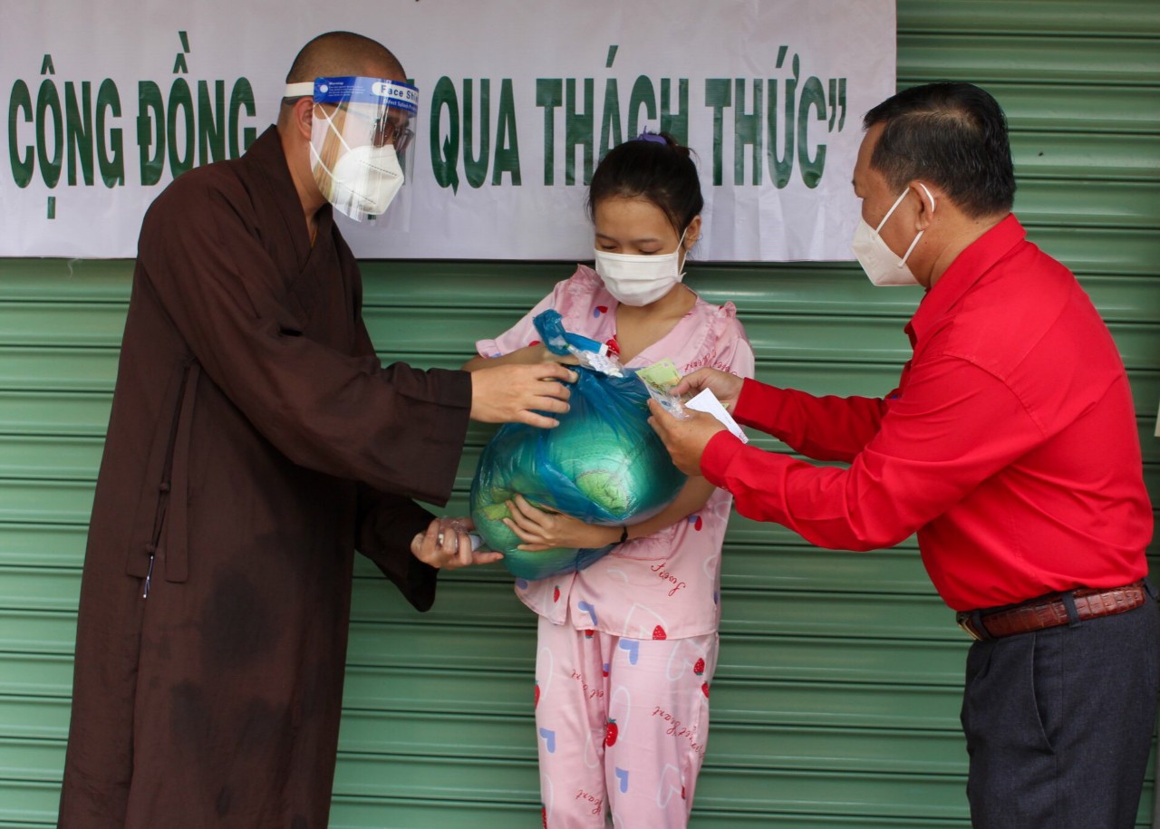 Ông Nguyễn Hoàng Ân – Phó Chủ tịch Hội Chữ thập đỏ TP.Hồ Chí Minh và Thượng tọa Thích Chơn Tịnh, Trụ trì Chùa Thường Quang, Quận 8 tặng quà đến người lao động có hoàn cảnh khó khăn bị ảnh hưởng bởi dịch bệnh Covid-19 Tham dự buổi trao quà, có ông Thạch Nghi…