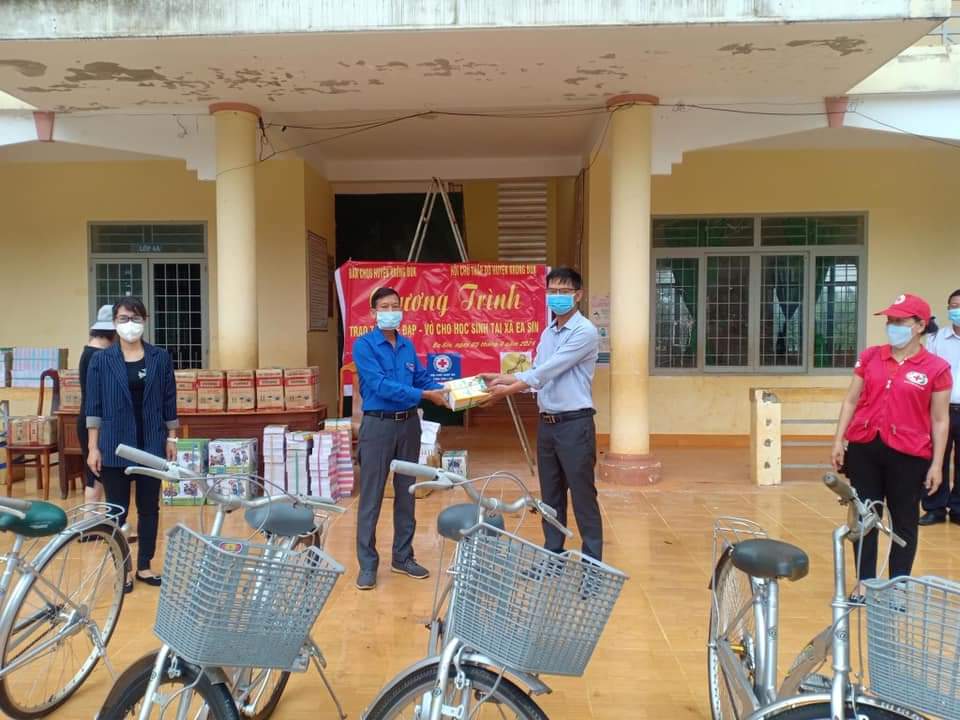 Tặng xe đạp cho các em học sinh có hoàn cảnh khó khăn Cùng ngày các mạnh thường quân cũng đã trao 01 tấn rau củ; 02 tạ trái Thăng Long cho bếp ăn bệnh viện huyện Krông Búk và xã Ea Sin huyện Krông Búk, tổng giá trị hỗ trợ tại chương trình 37 triệu…