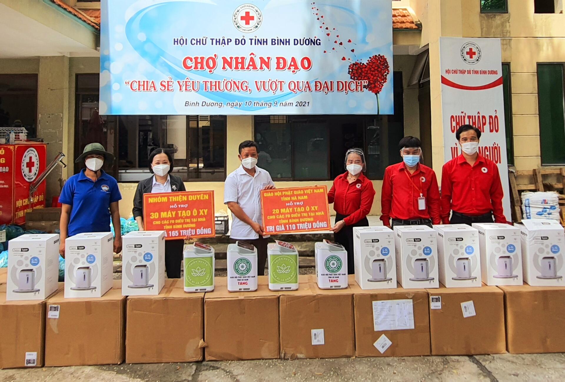 Bà Nguyễn Thị Lệ Trinh – Chủ tịch Hội Chữ thập đỏ tỉnh Bình Dương bàn giao lại cho Ban Chỉ đạo phòng, chống dịch Covid-19 TP.Thủ Dầu Một tất cả máy tạo oxy do bà Nguyễn Thị Xuân Thu vận động hỗ trợ Nhằm góp phần hỗ trợ cho các F0 điều trị tại nhà…