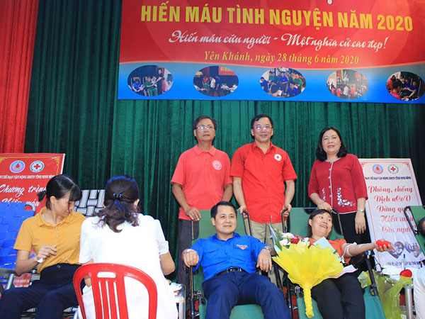 Vợ chồng anh Hợp, chị Hà (ở giữa) cùng tham gia HMTN tại huyện Yên Khánh nhân dịp kỷ niệm Ngày Gia đình Việt Nam (28/6/2020). Chúng tôi gặp gỡ vợ chồng anh Hợp, chị Hà đang tham gia hiến máu trực tiếp tại Bệnh viện Đa khoa tỉnh để cấp cứu và điều trị…