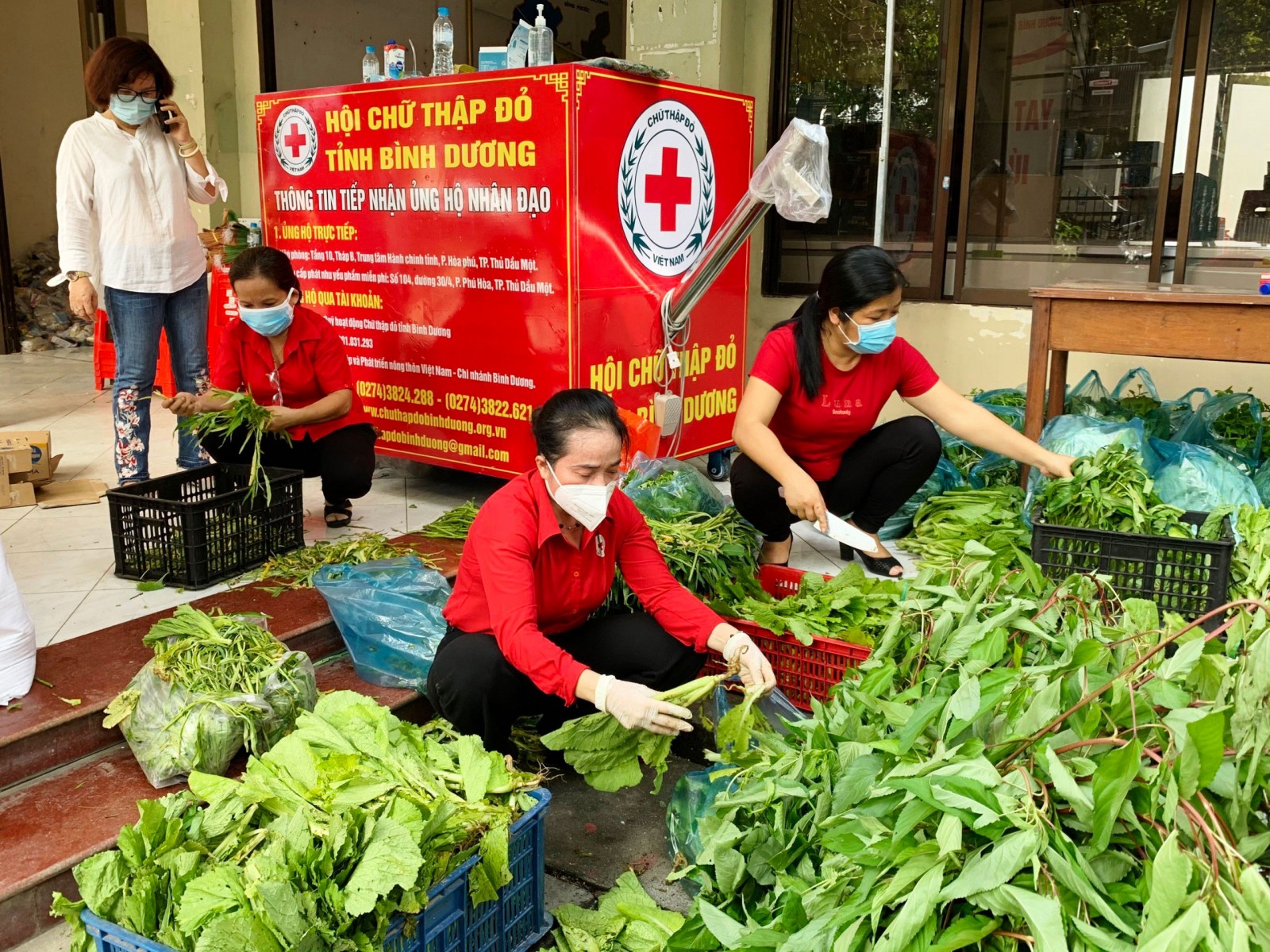 Bà Nguyễn Thị Lệ Trinh (ngồi trước phía trái), Chủ tịch Hội CTĐ tỉnh và các cán bộ hội tỉ mỉ ngồi nhặt lại từng bó rau trước khi trao gửi đến người dân Thầm lặng giữa mùa dịch bệnh Nhiều chuyến xe chở rau từ các tỉnh gửi đến cho nhân dân Bình Dương…