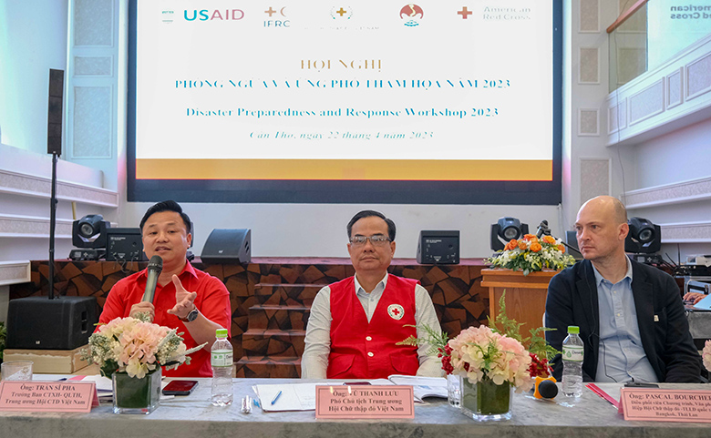 Ông Vũ Thanh Lưu – Phó Chủ tịch Trung ương Hội Chữ thập đỏ Việt Nam (ở giữa); ông Pascal Bourcher – Điều phối viên Chương trình Hiệp hội Chữ thập đỏ, Trăng lưỡi liềm đỏ quốc tế văn phòng tại Băng Cốc (bên phải) và ông Trần Sĩ Pha – Trưởng Ban CTXH – QLTH…