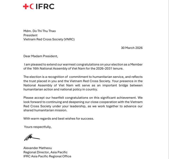 Ông Alexander Matheou, Trưởng đại diện Hiệp Hội Chữ thập đỏ và Trăng lưỡi liềm đỏ quốc tế (IFRC), Khu vực Châu Á – Thái Bình Dương, đã gửi lời chúc mừng nồng nhiệt, khẳng định việc bà Đỗ Thị Thu Thảo trúng cử Đại biểu Quốc hội là sự ghi nhận xứng đáng…