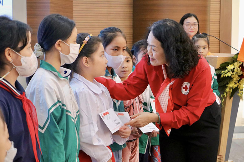 Bà Bùi Thị Hoà – Chủ tịch Trung ương Hội Chữ thập đỏ Việt Nam tặng quà cho các em học sinh. Dự chương trình có bà Bùi Thị Hoà – Bí thư Đảng Đoàn, Chủ tịch Trung ương Hội Chữ thập đỏ Việt Nam; đại diện lãnh đạo Trung ương Hội Liên hiệp…