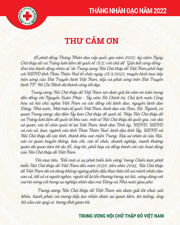 Trung ương Hội Chữ thập đỏ Việt Nam gửi Thư cảm ơn Lễ phát động Tháng Nhân đạo năm 2022