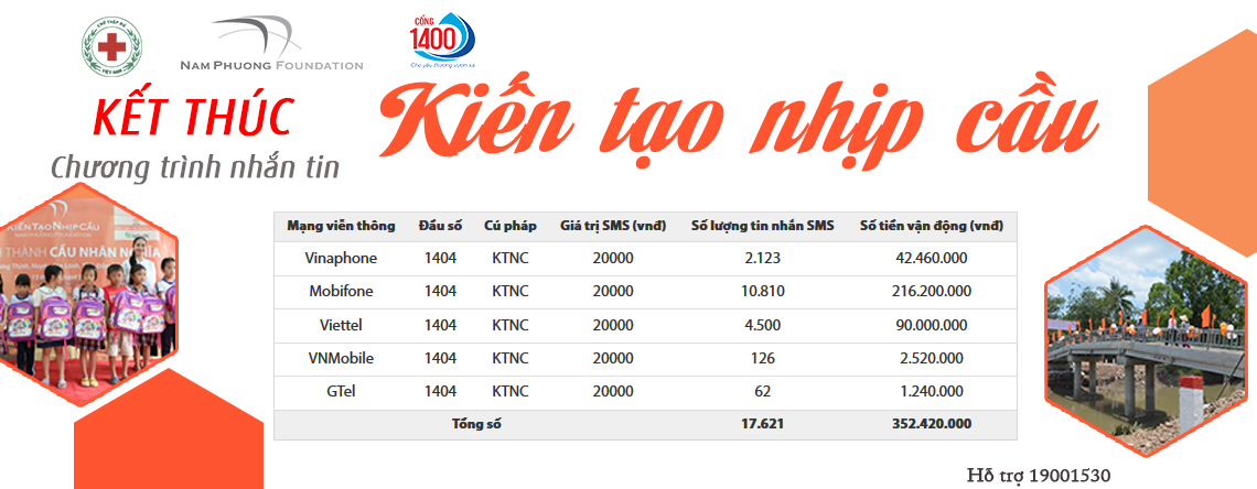 Ngày 21/9/2018, Cổng thông tin điện tử nhân đạo quốc gia (Cổng 1400) đã dừng tiếp nhận tin nhắn ủng hộ gửi đến chương trình “Kiến tạo nhịp cầu”. Chương trình nhắn tin “Kiến tạo nhịp cầu 2018” nhằm kêu gọi đồng bào cả nước hỗ trợ kinh phí xây dựng cầu mới và sửa…