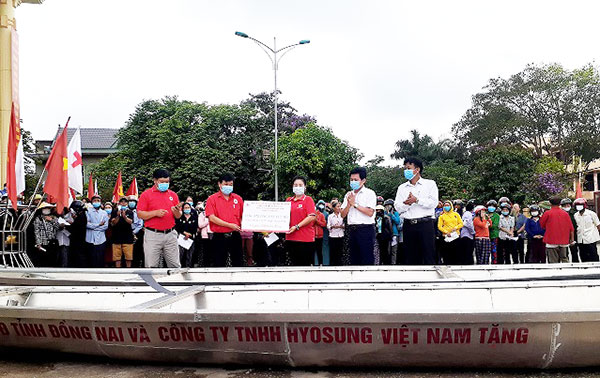 Bà Đỗ Thị Phước Thiện – Chủ tịch Hội Chữ thập đỏ tỉnh Đồng Nai trao biển tặng 5 thuyền máy cho các huyện, thị.