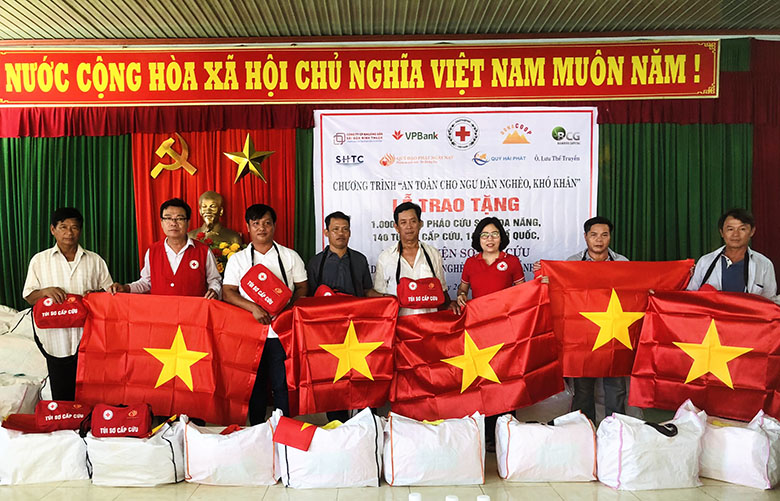 Tặng áo phao áo phao đa năng, túi sơ cấp cứu và lá cờ Tổ quốc cho ngư dân.
