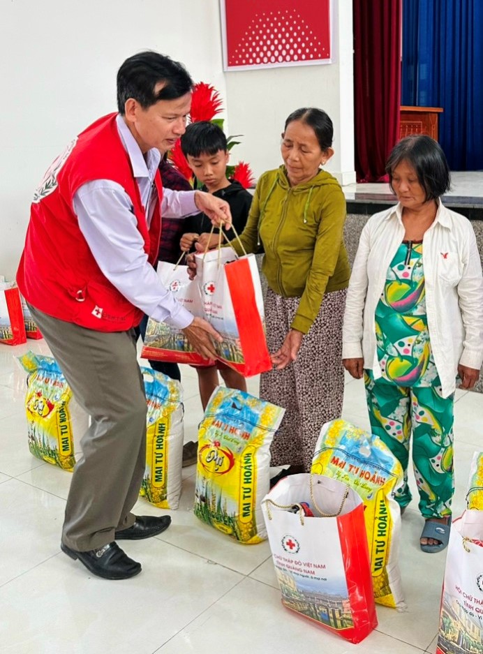 Lãnh đạo Hội Chữ thập đỏ tỉnh Quảng Nam tặng quà cho người dân.