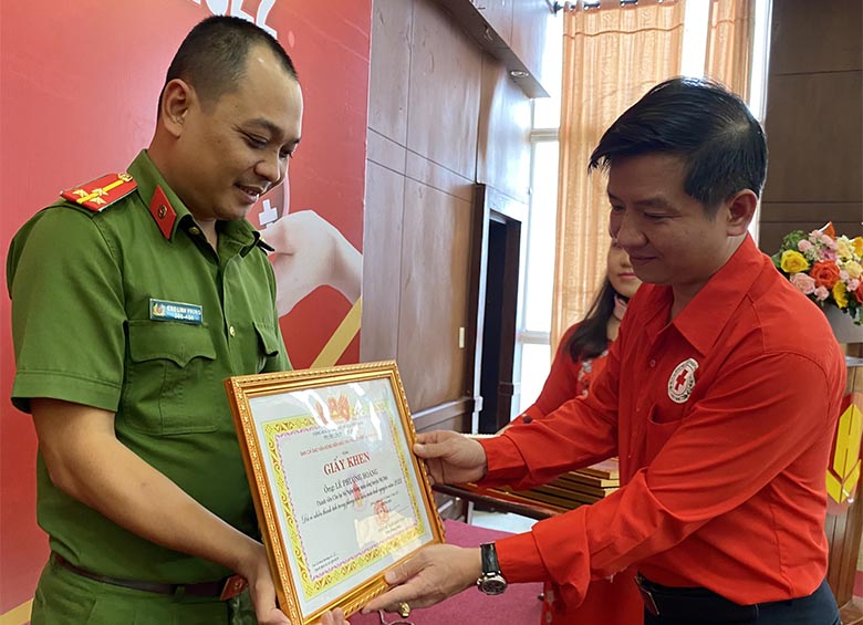 Ông Phạm Ngọc Thành (áo đỏ) – Chủ tịch Hội Chữ thập đỏ tỉnh Quảng Ngãi, Phó Ban Thường trực Ban Chỉ đạo vận động HMTN tỉnh trao tặng giấy khen của Ban Chỉ đạo cho người có thành tích trong phong trào hiến máu tình nguyện năm 2022.