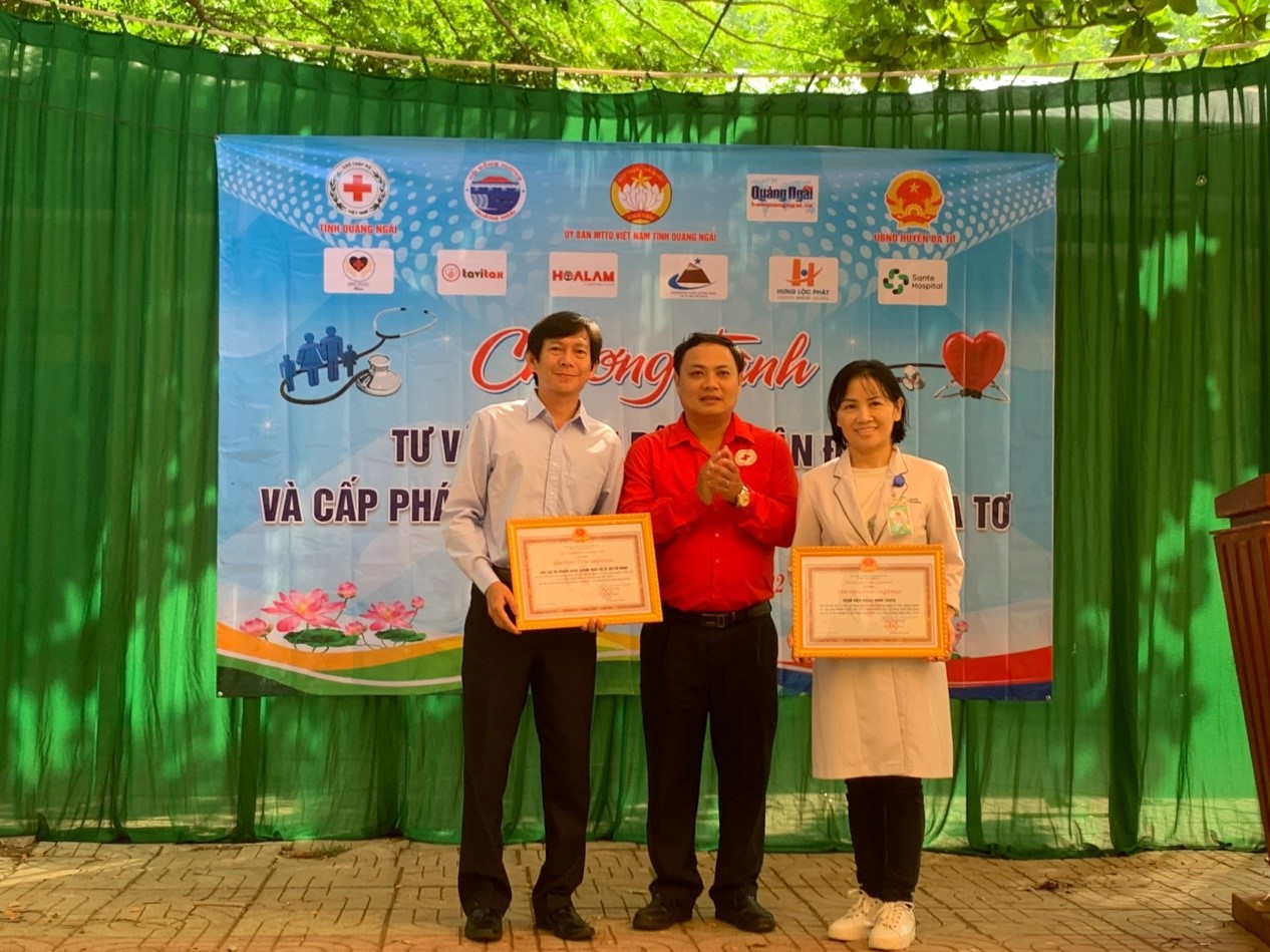 Đại diện Hội Chữ thập đỏ tỉnh Quảng Ngãi trao ghi nhận Tấm lòng vàng cho Bệnh viện Ngoại khoa Sante và đại diện các Nhà tài trợ chương trình.