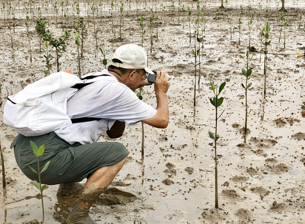 Chuyên gia của Tổ chức trồng rừng ngập mặn Nhật Bản (ACTMANG) khảo sát cây trồng tại rừng ngập mặn xã Hải Tiến (TP Móng Cái) tháng 12/2022.