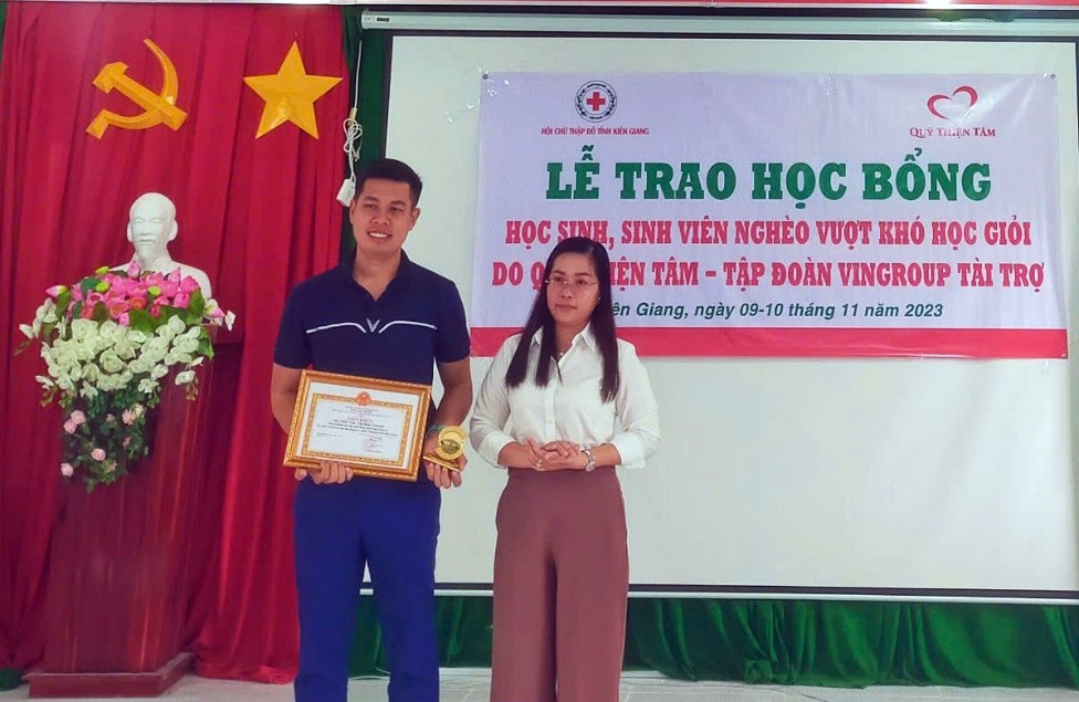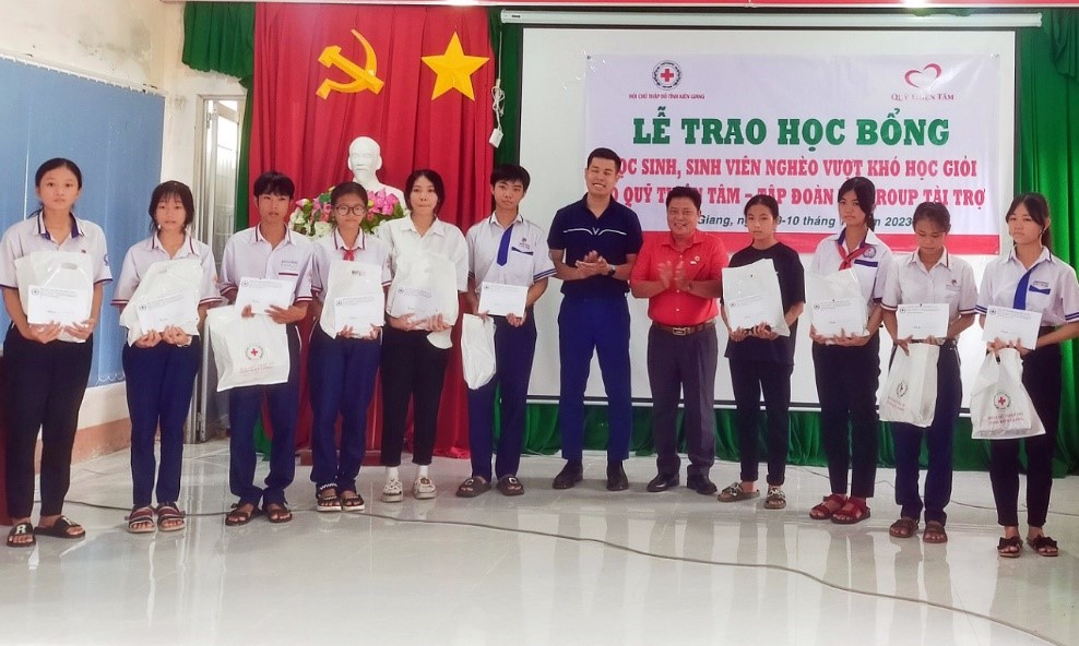 Lập thành tích chào mừng kỷ niệm 77 năm ngày thành lập Hội Chữ thập đỏ Việt Nam (23/11/1946 – 23/11/2023), từ ngày 09-10/11/2023 Hội Chữ thập đỏ tỉnh Kiên Giang phối hợp cùng Quỹ Thiện Tâm – Tập đoàn Vingroup tổ chức chức trao quà và hỗ trợ tiền mặt tại cho các em học sinh, sinh viên tại 11 huyện, thành phố trên địa bàn tỉnh.