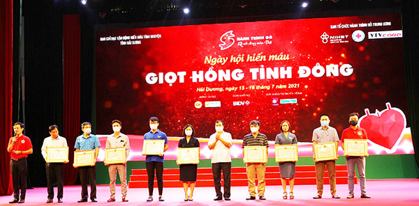 Cũng tại chương trình, Ban Chỉ đạo Vận động hiến máu tình nguyện tỉnh Hải Dương đã trao giấy khen đến 9 tập thể, cá nhân có thành tích xuất sắc trong phong trào hiến máu tình nguyện năm 2021.