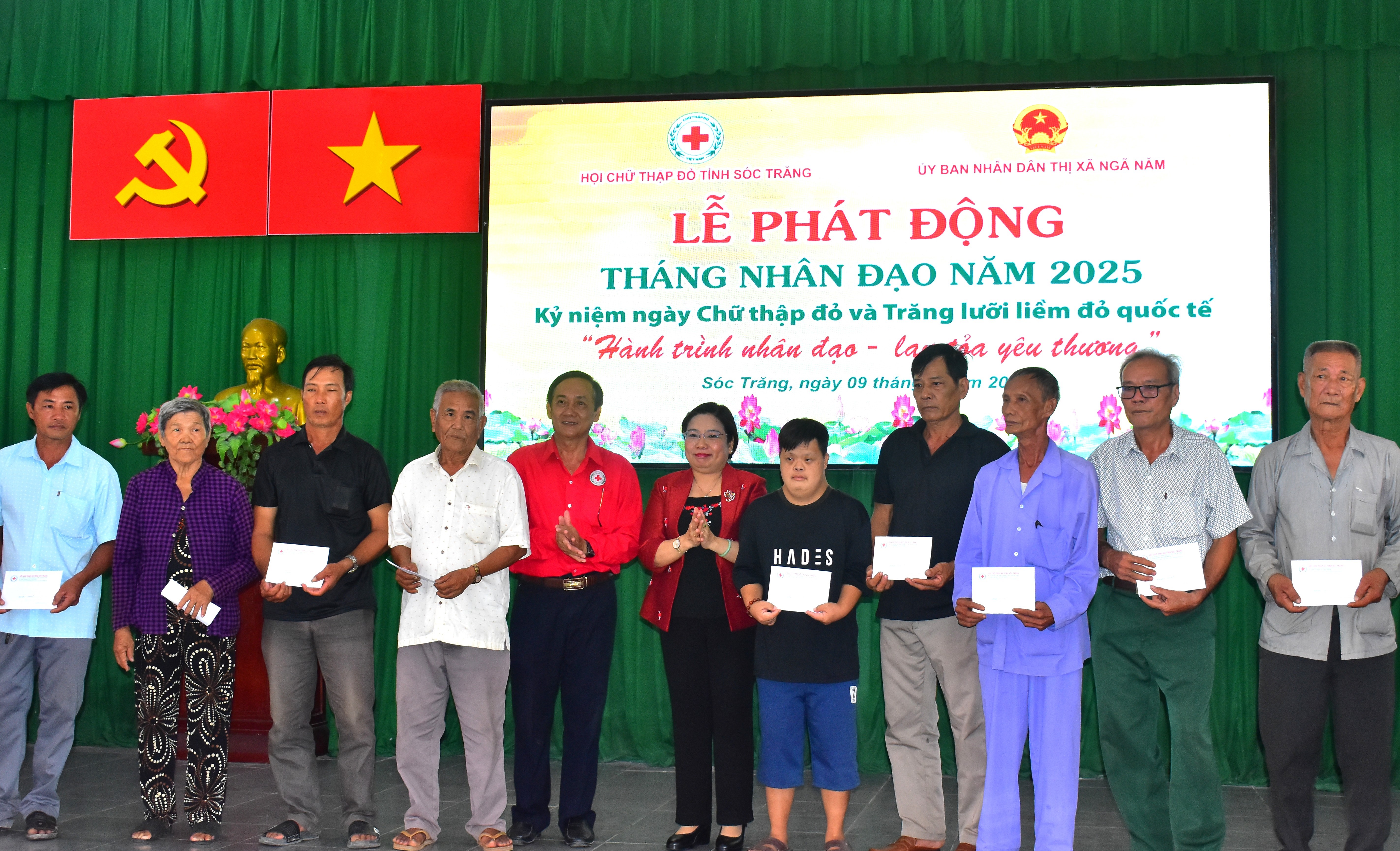 Hưởng ứng Tháng Nhân đạo 2025, nhiều hoạt động ý nghĩa đã được triển khai ngay tại buổi lễ như: trao bảng tượng trưng hỗ trợ 2 địa chỉ nhân đạo từ Văn phòng Tỉnh ủy Sóc Trăng; Đội tình nguyện SV07 trao tặng 24 căn nhà, 180 xe đạp và tổ chức 12 lượt nấu ăn từ thiện; Câu lạc bộ “Trao niềm hy vọng” hỗ trợ 12 hoàn cảnh mắc bệnh hiểm nghèo; Hội Chữ thập đỏ tỉnh tặng 20 phần quà cho gia đình nạn nhân chất độc da cam và hộ khó khăn, trao 10 suất học bổng trị giá 1 triệu đồng/suất cho học sinh vượt khó học giỏi; đồng thời trao 400 bộ đồng phục cho học sinh Trường Mầm non Phường 2, thị xã Ngã Năm.