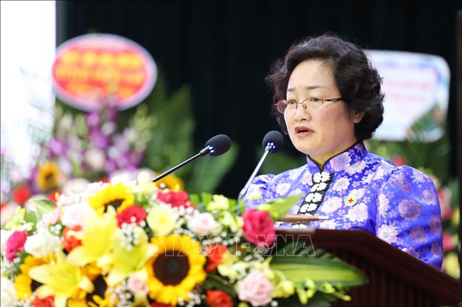Bà Bùi Thị Hòa, Chủ tịch Trung ương Hội Chữ thập đỏ Việt Nam phát biểu tại Đại hội. Ảnh: Hữu Quyết/TTXVN