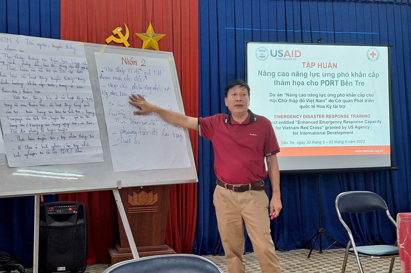 Đến dự lớp tập huấn có ông Đặng Văn Tạo – Cán bộ Quản lý dự án-Trung ương Hội Chữ thập đỏ Việt Nam; hai báo cáo viên của lớp là bà Dương Thị Tuấn Anh – Phó Chánh văn phòng Hội Chữ thập đỏ tỉnh Khánh Hòa và ông Đoàn Quảng Trị – Trưởng Ban Công tác xã hội-Quản lý thảm họa Hội Chữ thập đỏ tỉnh Thừa Thiên Huế; ông Võ Văn Hoanh – Chủ tịch tỉnh Hội Bến Tre; cùng 21 học viên là thành viên trong Đội PDRT.