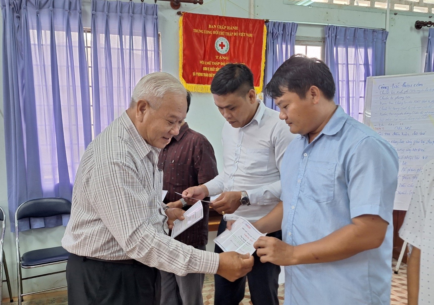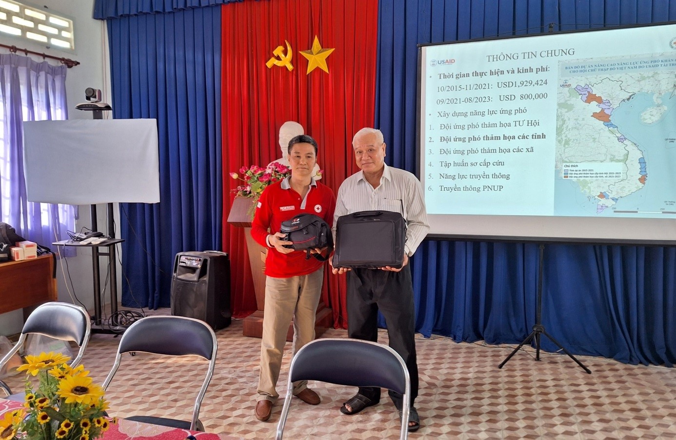 Ông Đặng Văn Tạo đại diện Trung ương Hội trao tặng một máy laptop và một máy chụp ảnh cho tỉnh Hội Bến Tre phục vụ công tác ứng phó khẩn cấp thiên tai, thảm họa. Nguồn kinh phó do Cơ quan Phát triển Quốc tế Hoa Kỳ tài trợ.