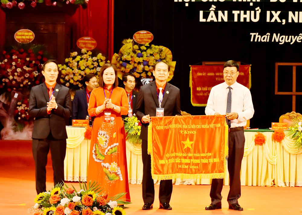 Hội Chữ thập đỏ tỉnh Thái Nguyên đón nhận Cờ thi đua của Chính phủ năm 2021.