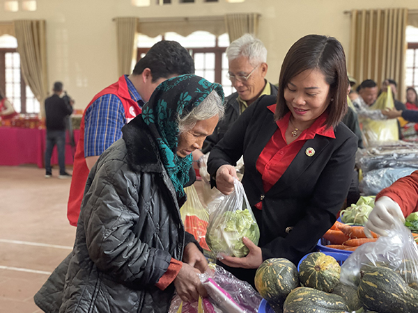 Bà Kiều Thị Thao – Chủ tịch Hội Chữ thập đỏ tỉnh Thái Nguyên hỗ trợ người dân nhận quà