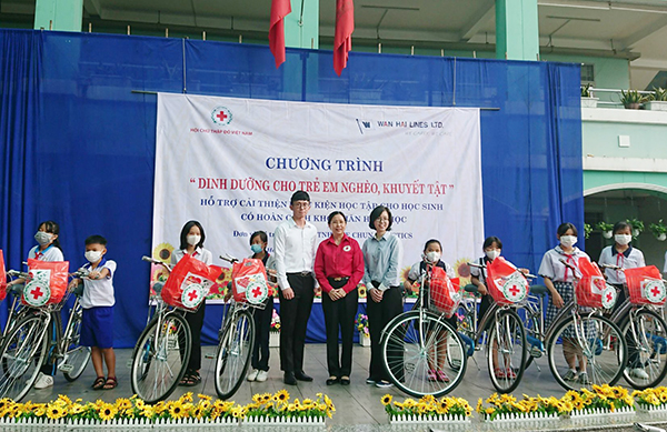 Bà Huỳnh Thị Xuân Lam – Phó Chủ tịch Trung ương Hội Chữ thập đỏ Việt Nam (áo đỏ ở giữa) cùng đại diện nhà tài trợ trao tặng xe đạp cho các em học sinh khó khăn.