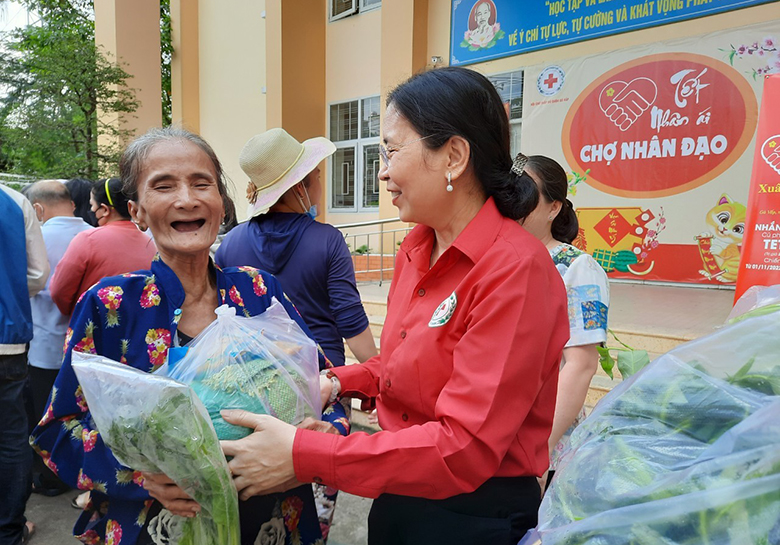 Bà Huỳnh Thị Xuân Lam – Phó Chủ tịch Trung ương Hội Chữ thập đỏ Việt Nam trao quà cho người dân tại chợ Nhân đạo.