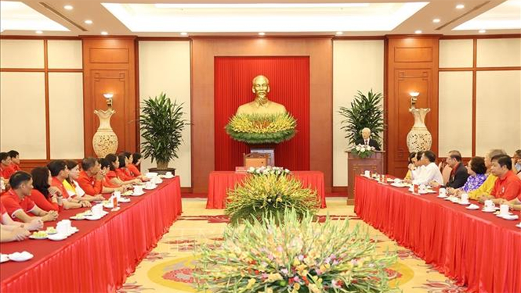 Tại cuộc gặp mặt, Chủ tịch Hội Chữ thập đỏ Việt Nam Bùi Thị Hòa báo cáo với Tổng Bí thư về tình hình, kết quả công tác nhân đạo, hoạt động nổi bật của Hội Chữ thập đỏ Việt Nam; nghe một số đại biểu tiêu biểu chia sẻ về quá trình tham gia và đóng góp cho hoạt động nhân đạo, từ thiện do Hội Chữ thập đỏ và các cấp hội phát động, tổ chức.