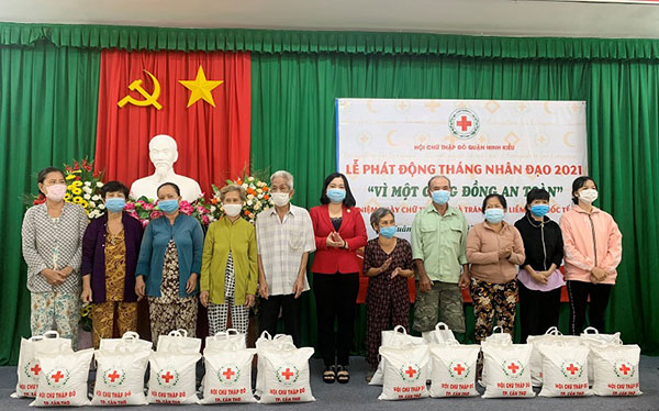 Trao quà cho người nghèo quận Ninh Kiều tại lễ phát động “Tháng Nhân đạo”.