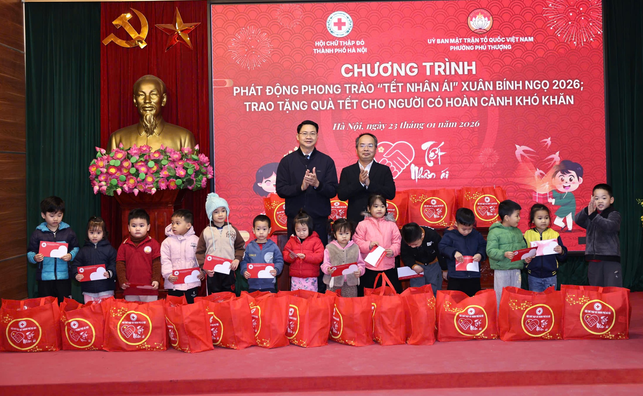 Tại chương trình, Hội Chữ thập đỏ TP. Hà Nội đã trao 115 suất quà Tết, mỗi suất trị giá 600.000 đồng (gồm 300.000 đồng tiền mặt và quà), tặng 100 người có hoàn cảnh khó khăn, học sinh có hoàn cảnh khó khăn trên địa bàn phường Phú Thượng và 15 giáo viên, nhân viên Trường PTCS Dân lập Dạy trẻ câm điếc Hà Nội, đơn vị trực thuộc Hội.
