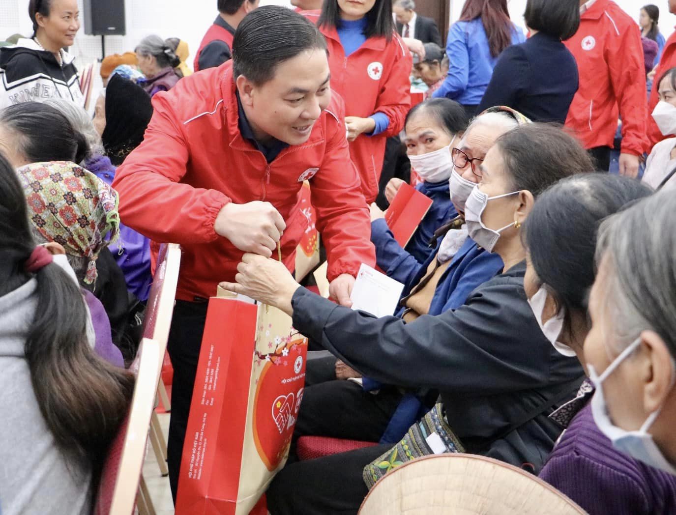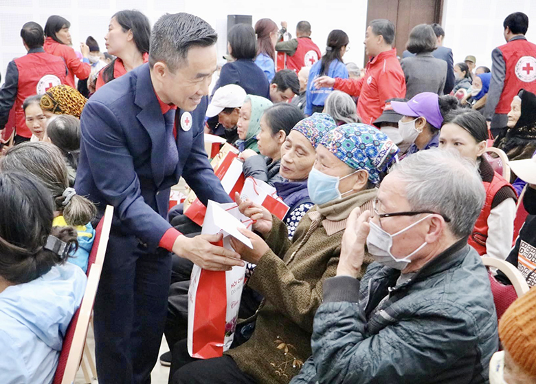 Ông Trần Sỹ Pha – Trưởng Ban Công tác xã hội và Quản lý thảm hoạ Hội Chữ thập đỏ Việt Nam trao những suất quà Tết tới người dân