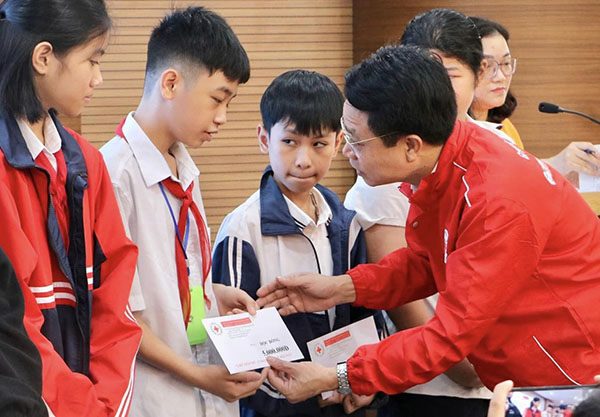 Ông Đào Ngọc Triệu – UVBTV Trung ương Hội, Chủ tịch Hội Chữ thập đỏ thành phố Hà Nội trao quà cho các em học sinh.