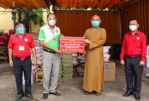 Ông Nguyễn Hoàng Ân – Phó Chủ tịch Hội Chữ thập đỏ TP.Hồ Chí Minh và Thượng tọa Thích Huệ Công – Quyền Trưởng ban Ban Trị sự Giáo hội Phật giáo Việt Nam quận 8, trụ trì Chùa Long Hoa trao quà hỗ trợ đến đồng bào dân tộc Hoa có hoàn cảnh khó khăn